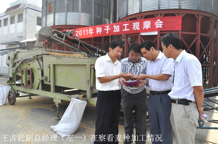 8月25日,安徽皖垦种业股份有限公司在潘村湖农场召开2011年种子加工观摩会,来自皖垦种业本部及其旗下的13家分公司领导考察观摩了明光分公司小麦种子加工中心生产情况,汇报交流了各分公司工作进展情况,并就切实抓好今年小麦种子加工工作,保障种子质量,实现以质促销目标进行了座谈。会议由皖垦种业股份有限公司副总经理吴久好主持,潘村湖农场场长柏华胜致欢迎辞。省农垦集团副总经理、皖垦种业总经理王占廷到会并作讲话。