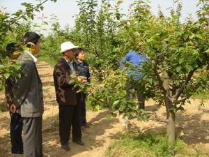3月初,日本果树专家香取茂男先生来宿州市讲课 之际,在砀山果园场实地修剪了一棵圆黄梨树。 “远路和尚”的经念得到底如何?5月15日上午, 砀山果园场生产技术部的技术人员抱着实事求是的 科学态度现场察看。图为科技人员正在调查修剪反 应情况。(李恒美)